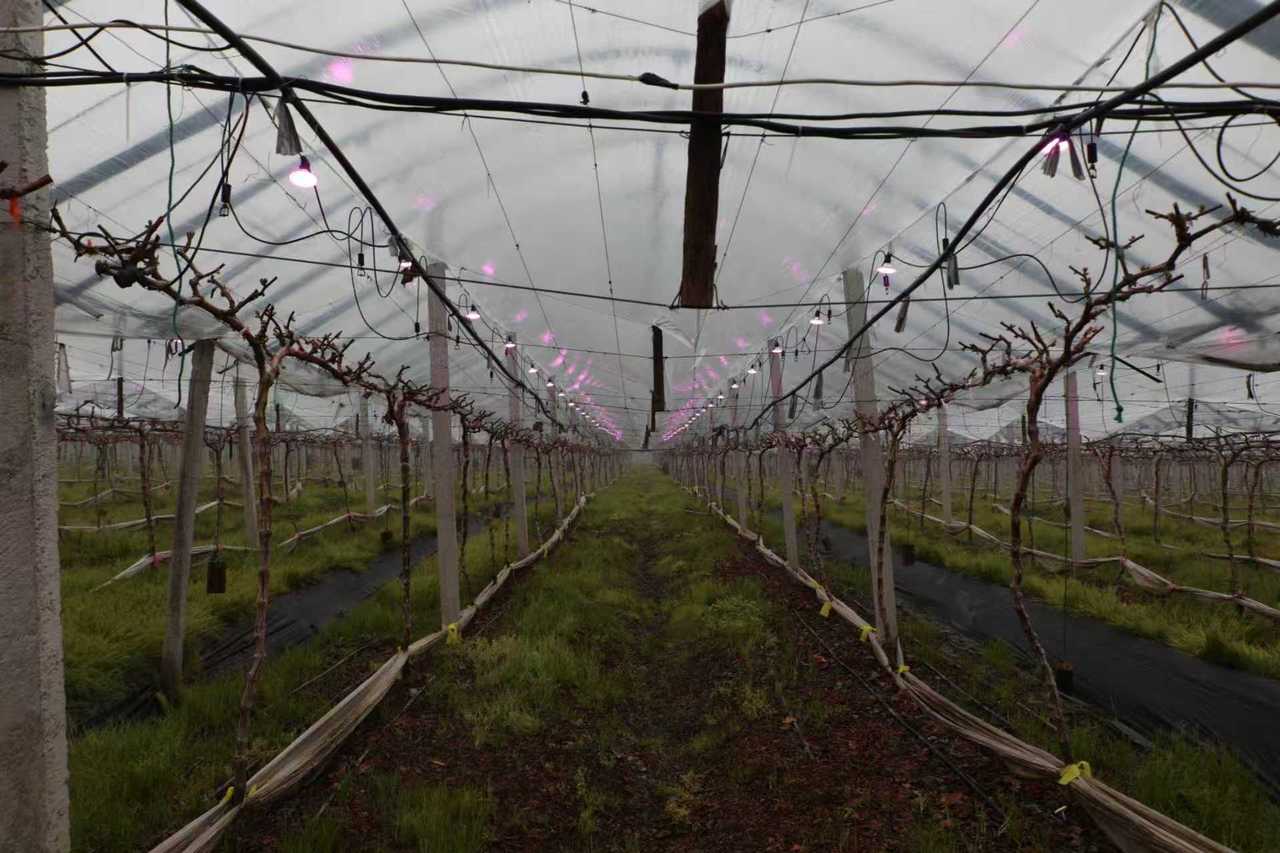 掀开两层厚重棚膜进入内室,暖意混着泥土气息扑面而来。特早熟品种天工墨玉葡萄已进入新梢生长关键期,眼下,枝头点点叶芽初萌,有的已舒展嫩叶,有的仍似绒绒花苞,生机暗涌。“如果温度持续走低,补光灯随时可启用,”陈海栋指向棚顶,“它不仅能补光,还能提温抑湿,降低病害风险。”