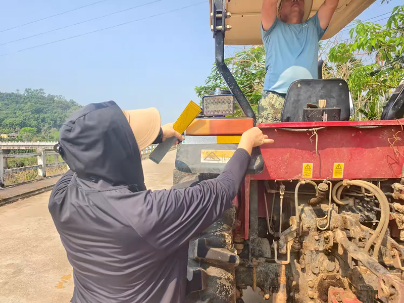 活动现场,工作人员严格执行检测标准,运用专业设备对拖拉机制动、照明等关键系统进行精准核验,并对发动机号、车架号等信息逐一核对确认。对不符合安全技术规范的机具坚决不予通过,从源头筑牢安全防线。同时,工作人员结合现场检查,向农机手普及安全操作规范与法律法规,发放宣传资料,有效提升了农户的安全生产意识。