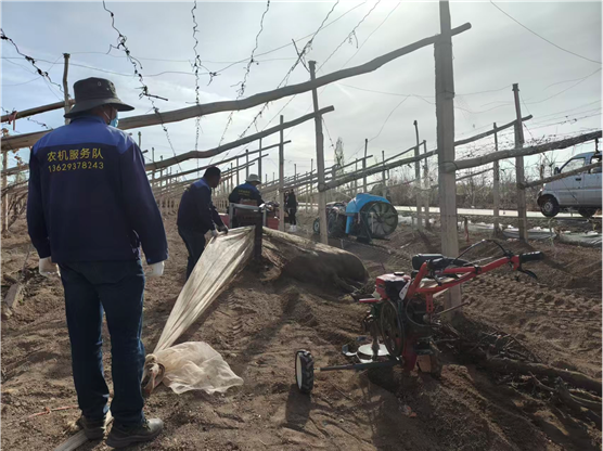 近日,甘肃省敦煌市树林农机服务农民专业合作社为有效降低葡萄种植春季出土拉膜的劳动强度和作业成本、提高劳动生产效率,在敦煌市农机服务中心的指导下,借鉴新疆葡萄种植拉膜机生产制造技术,结合当地实际研发出一款适宜在葡萄架下开展作业的拉膜机,于田间开展试验验证并取得成功。
