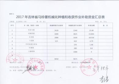 2017年吉林省马铃薯机械化种植和收获作业补助资金汇总表