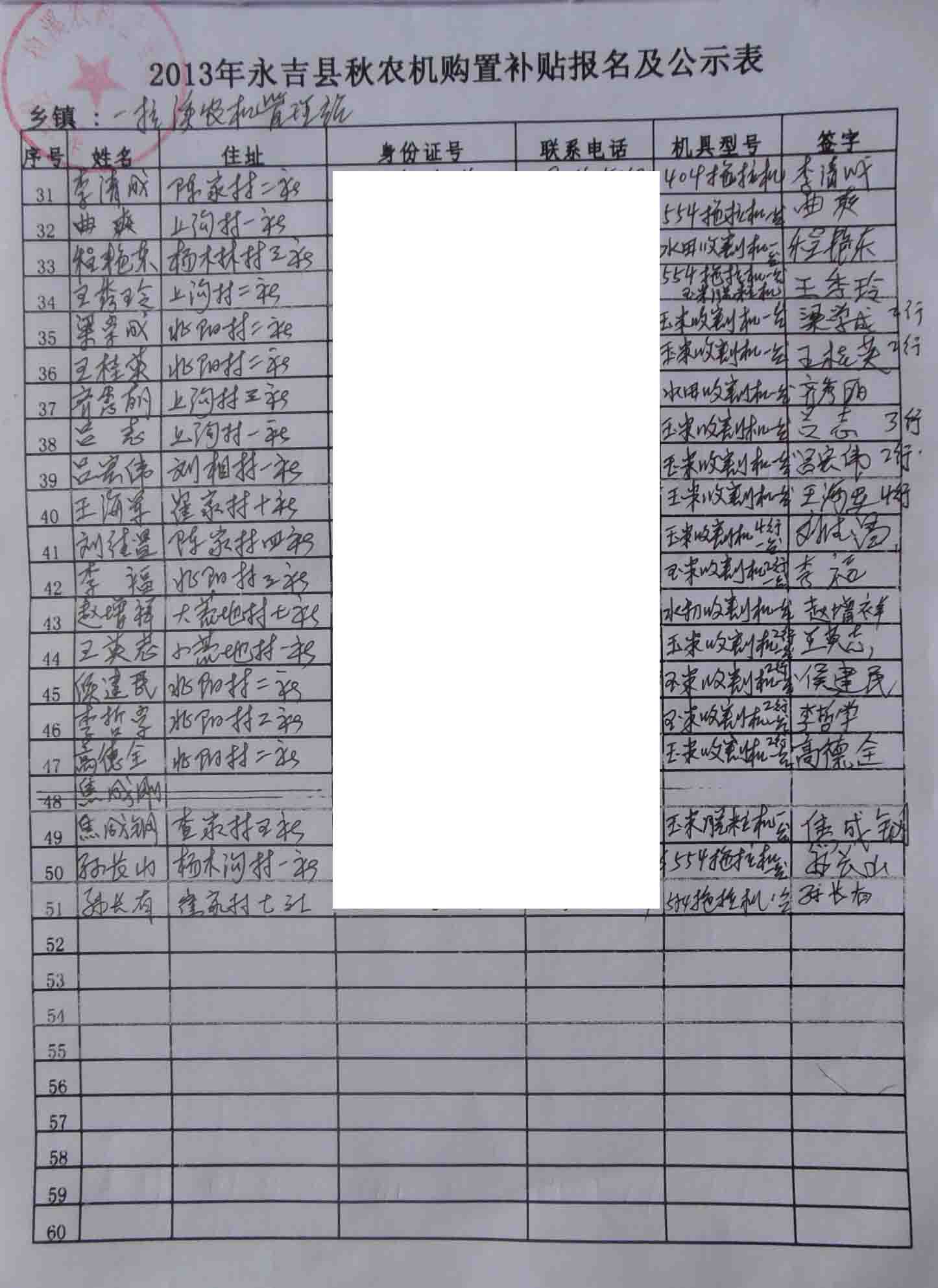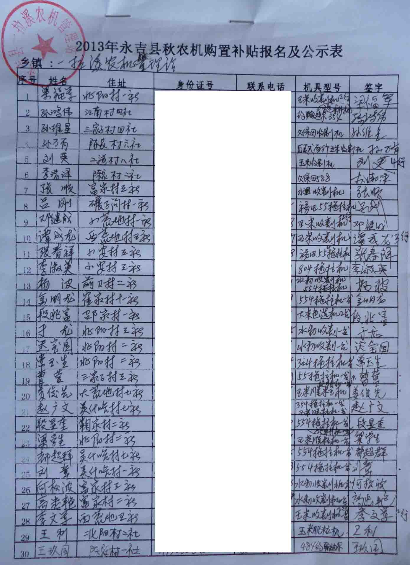 2013年秋季永吉县一拉溪镇农机购置补贴报名公示