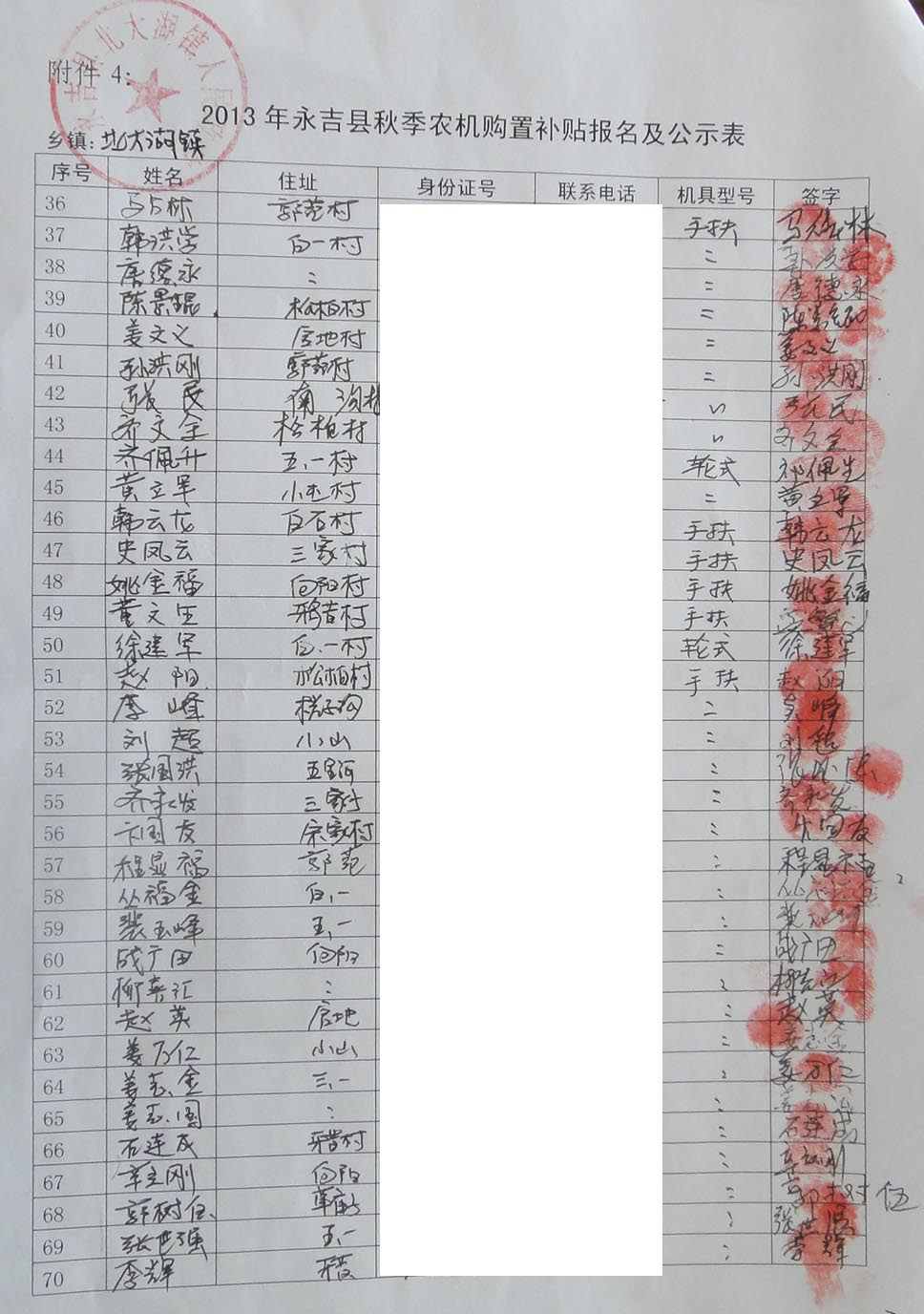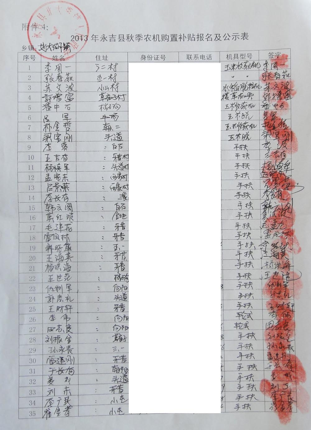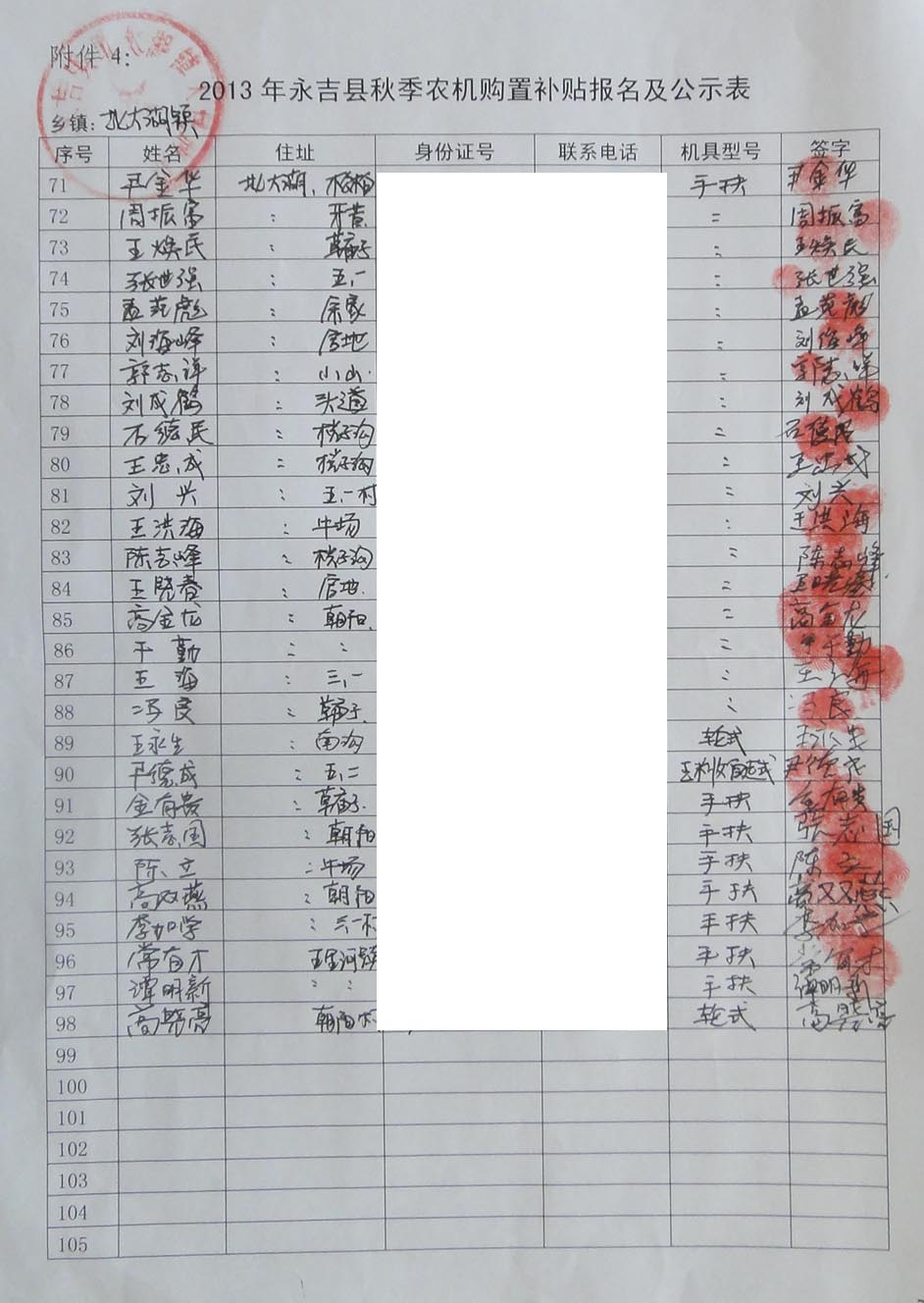 2013年秋季永吉县北大湖镇农机购置补贴报名公示