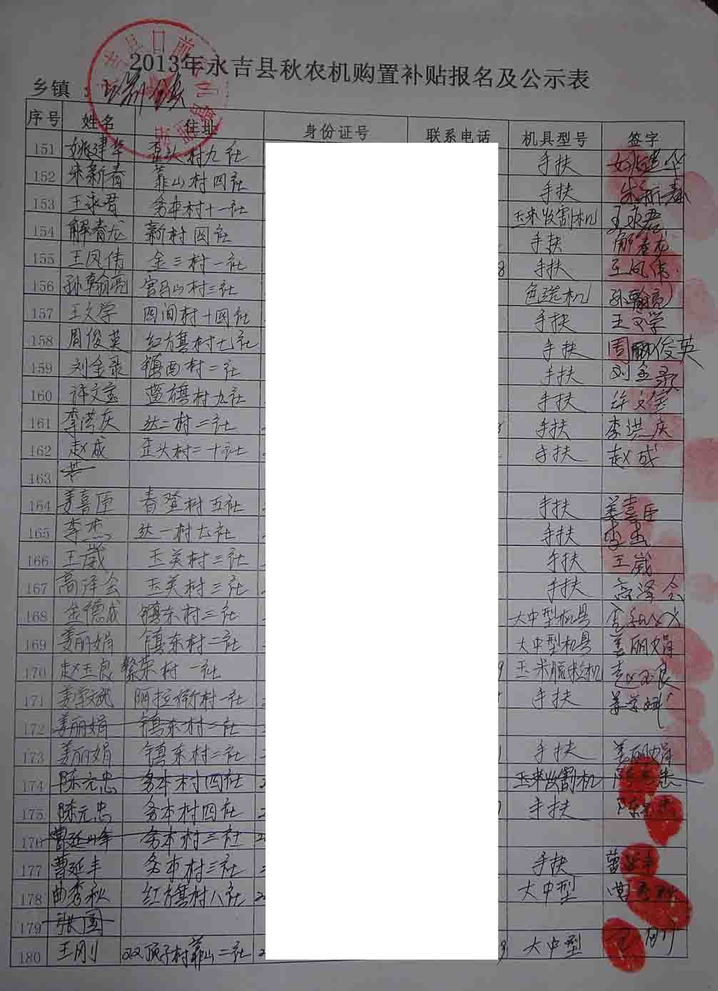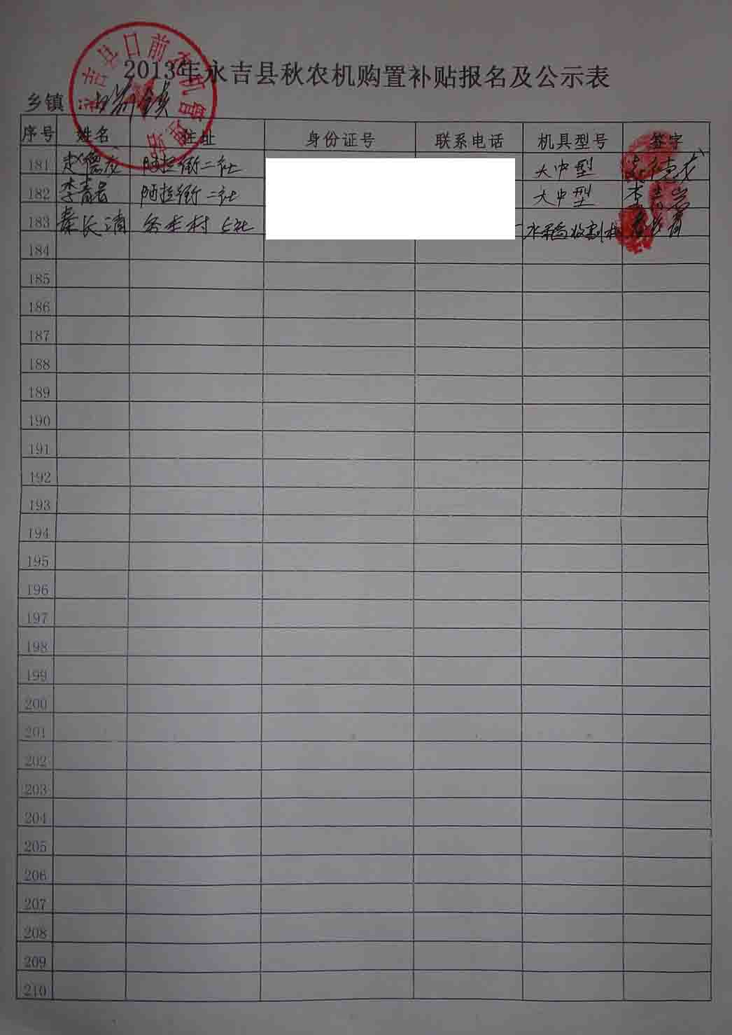 2013年秋季永吉县口前镇农机购置补贴报名补充公示